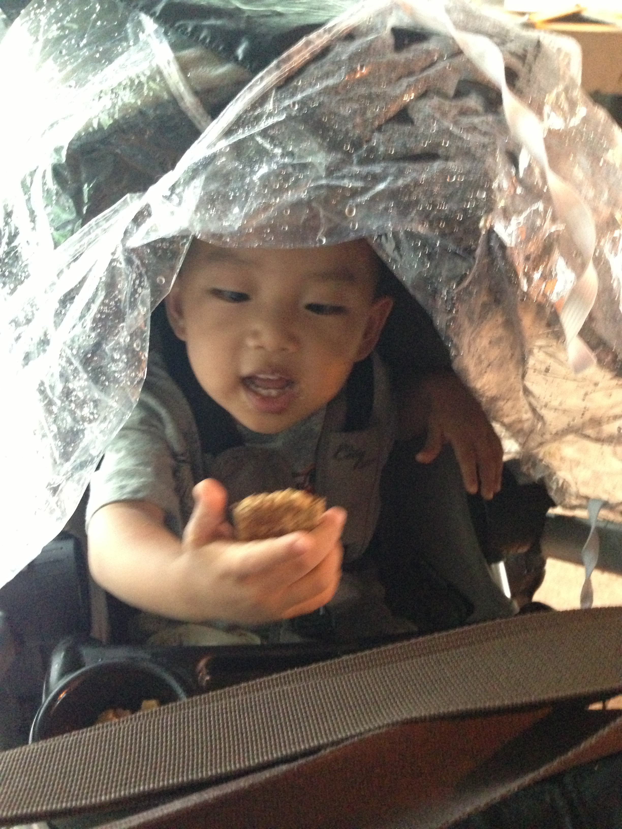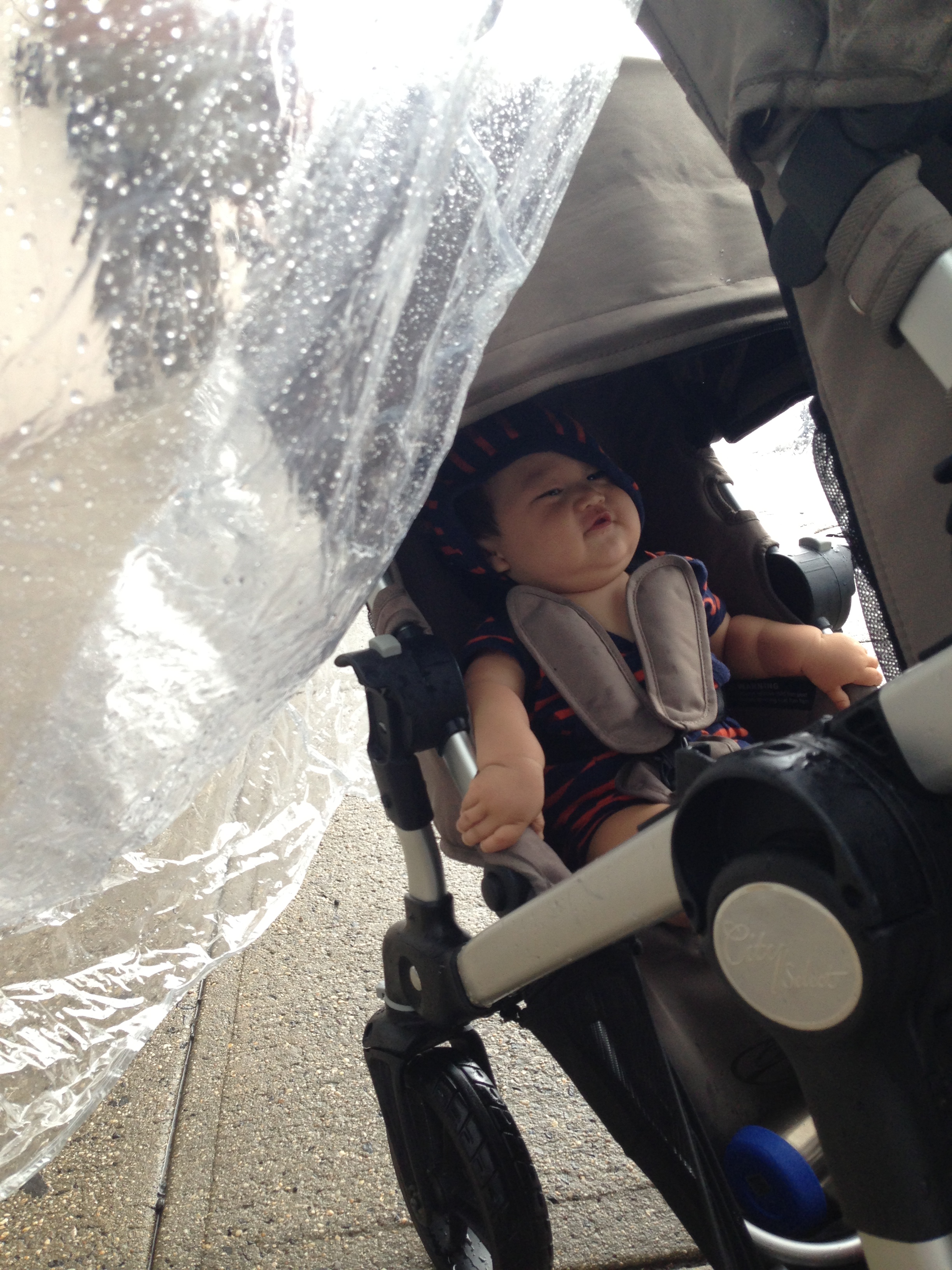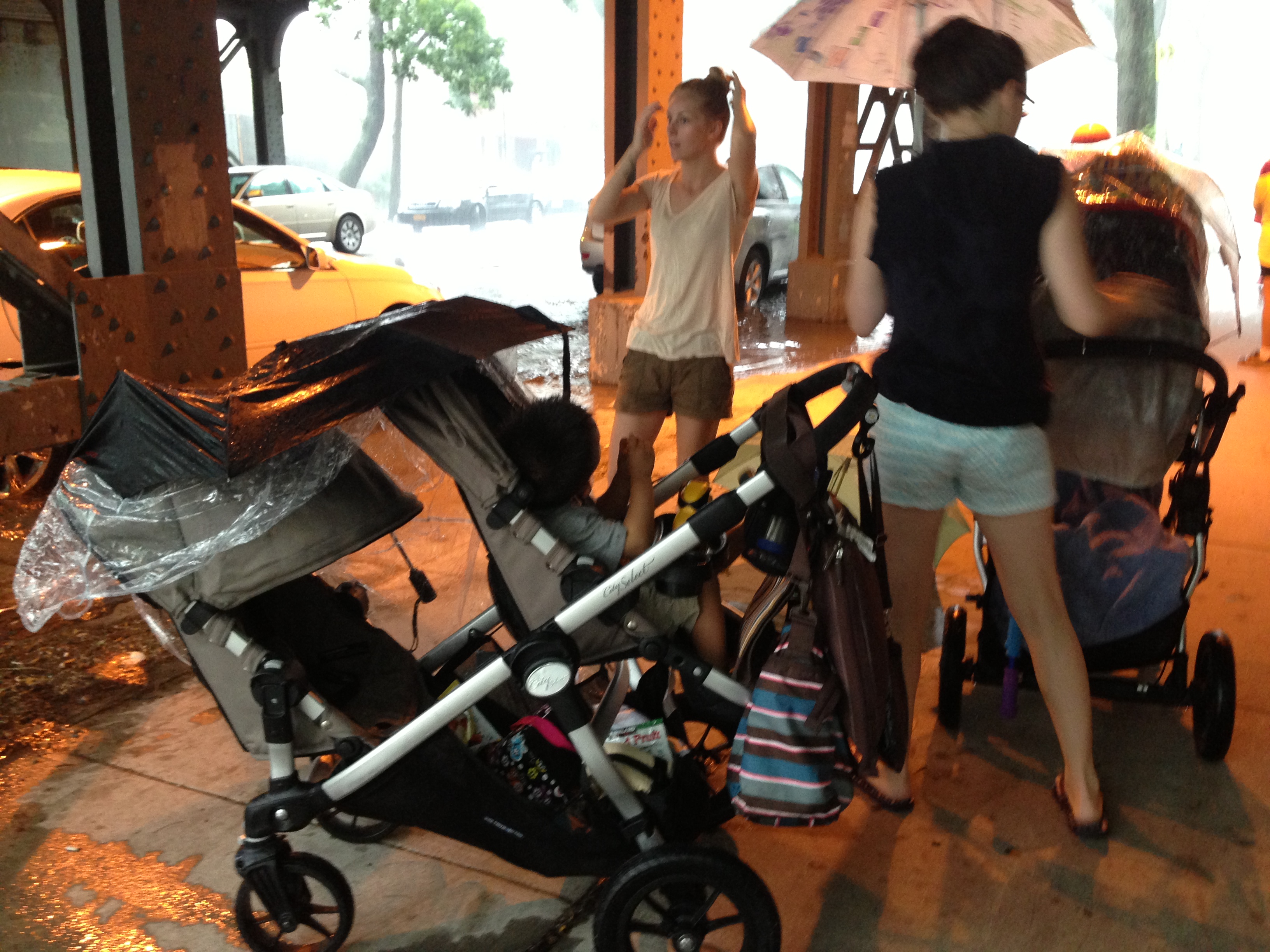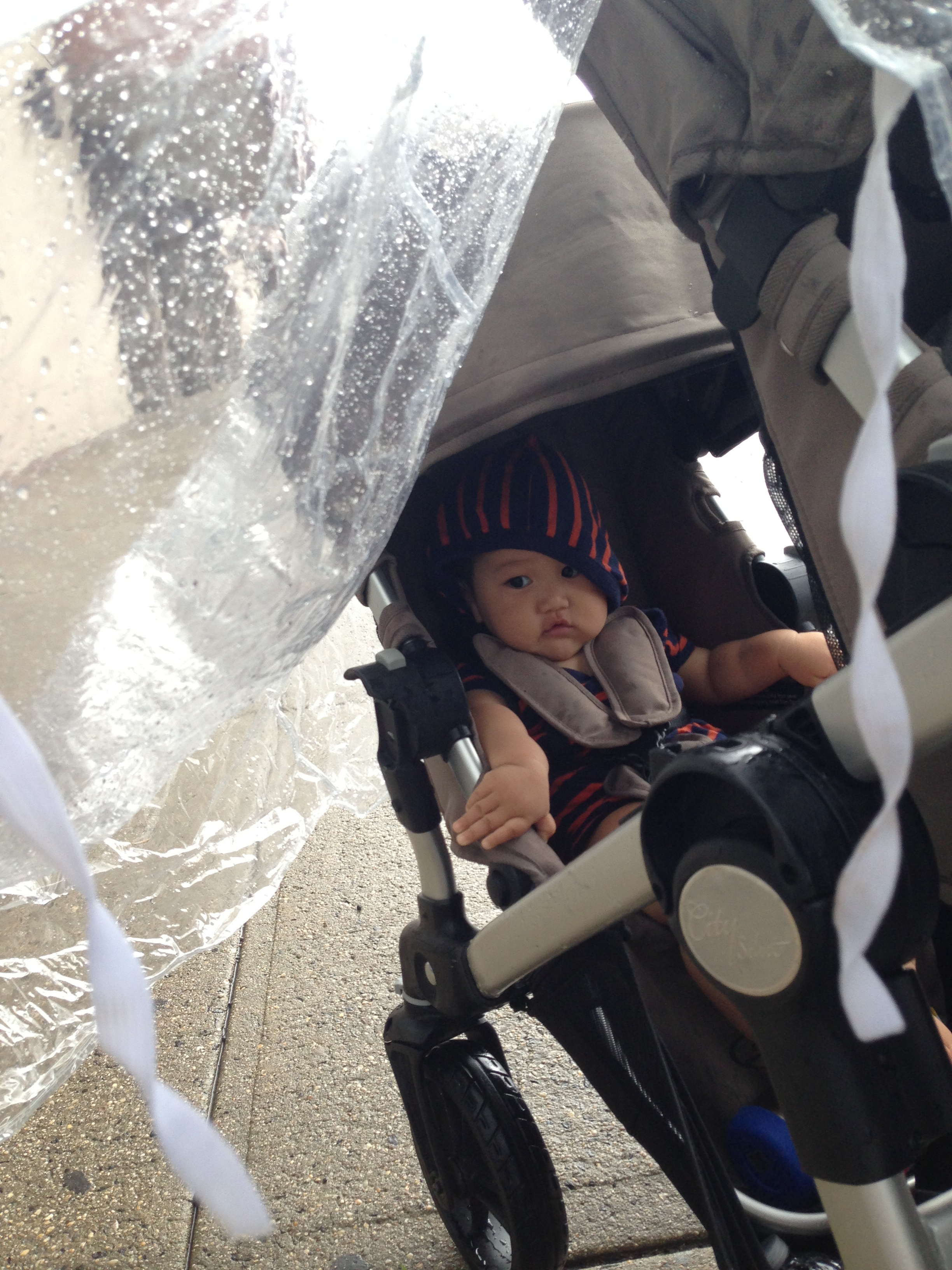 We were out since 9:30 am for some good ol’ fashioned tree-chasing at our local park with some neighborhood kids we had so much fun playing with last time. The weather channel failed us once again. It had only warned of a 30% chance of “isolated thunderstorms” starting at 1 pm but before it hit noon, I got drenched. I shouldn’t be surprised since the weather website says “0% chance of rain” WHILE it is raining on me. Kids stayed dry thanks to the Metro North tracks (see pictures below) and plastic stroller cover.