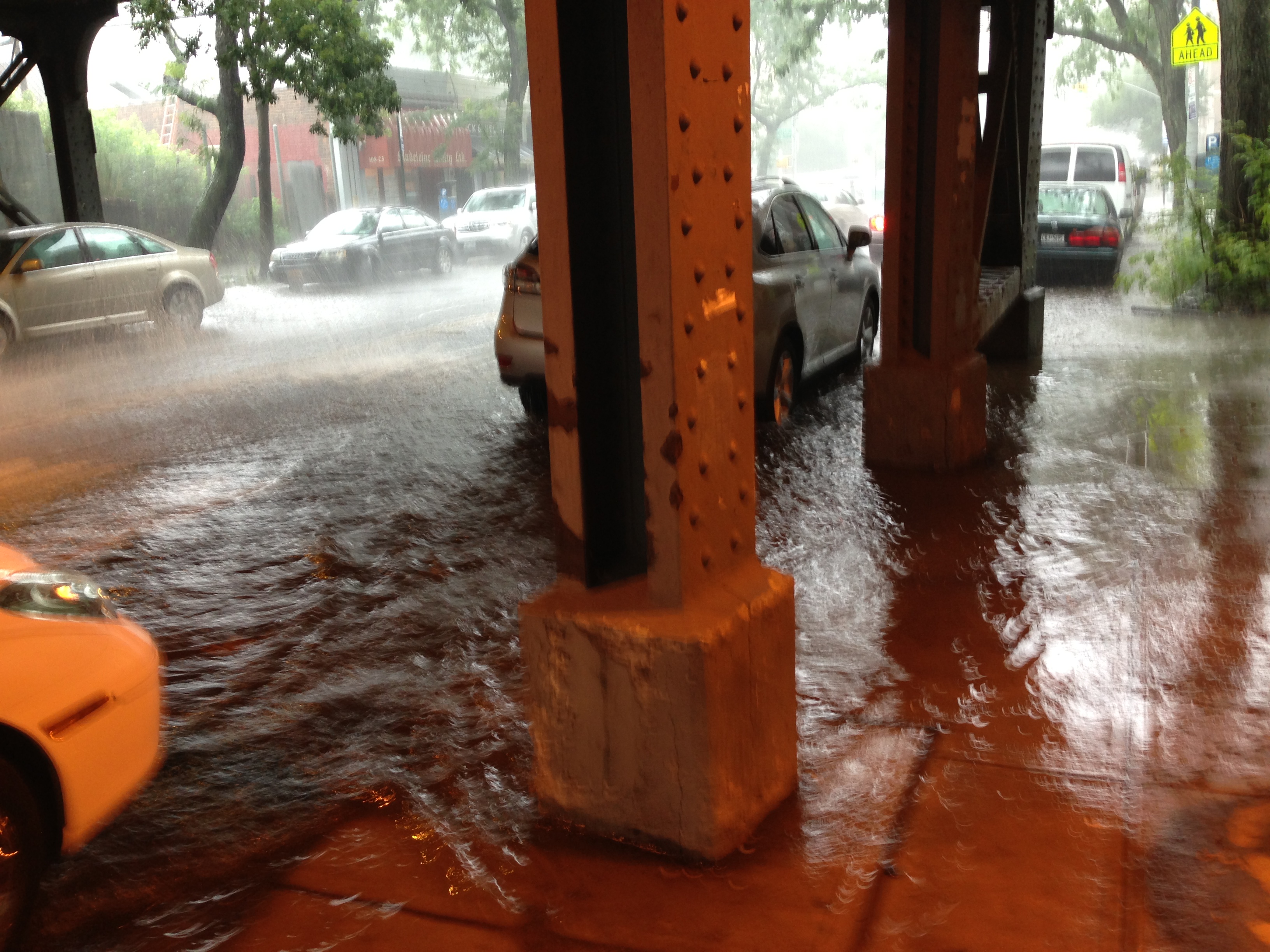 seconds after the drizzle turned into torrential downpour, we found shelter under the Metro North tracks.  GOOD LOOKIN' OUT, METRO NORTH!