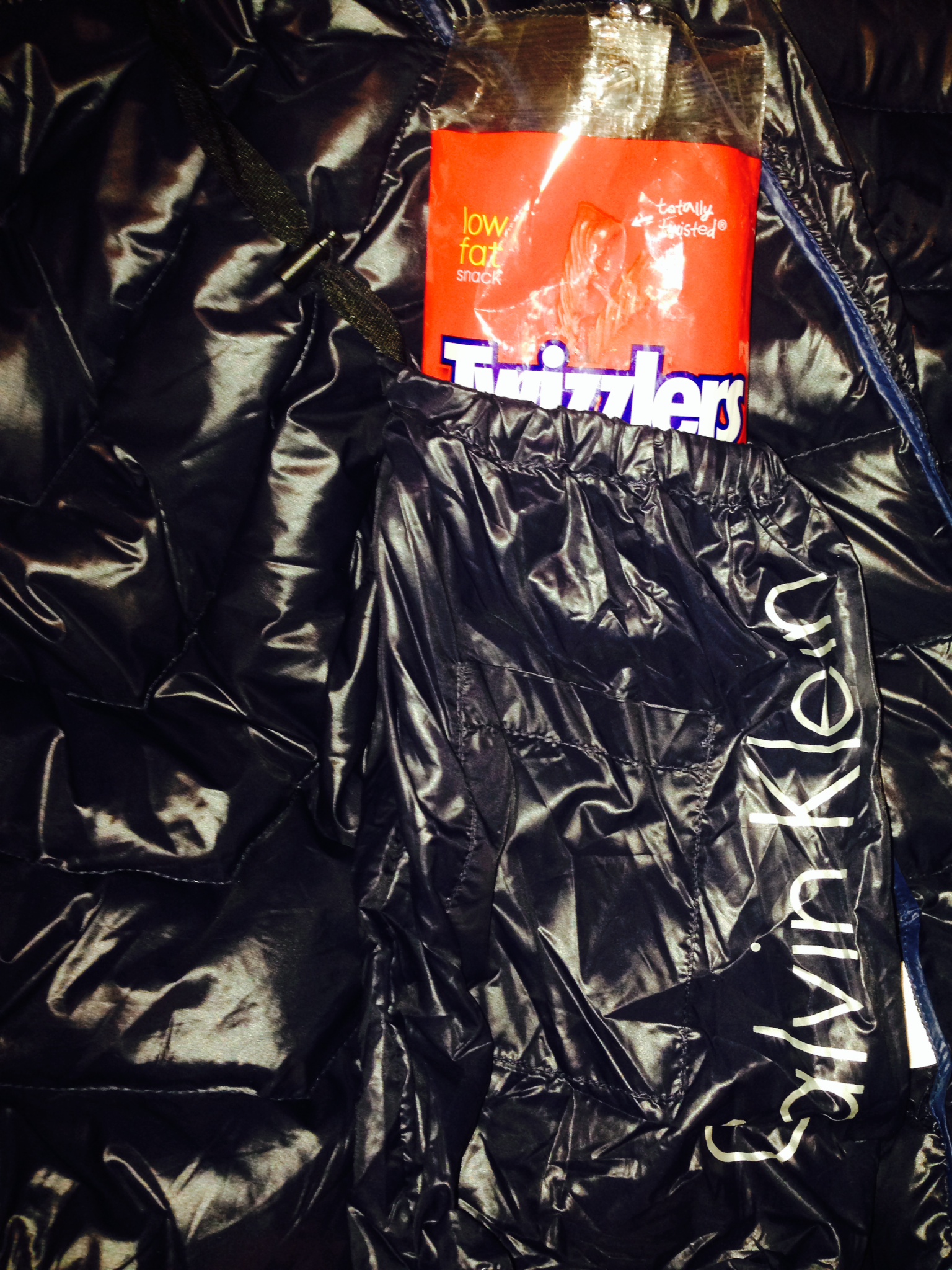 It had been raining 100% of that day continuing into the night. We linked arms under my bigger umbrella and speed-walked into the theater after coming up on some decent parking. We laughed about my coat’s secret compartment. Perfectly sized to sneak in my contraband Twizzlers purchased from Target earlier that day while Christmas decoration shopping with the family.
