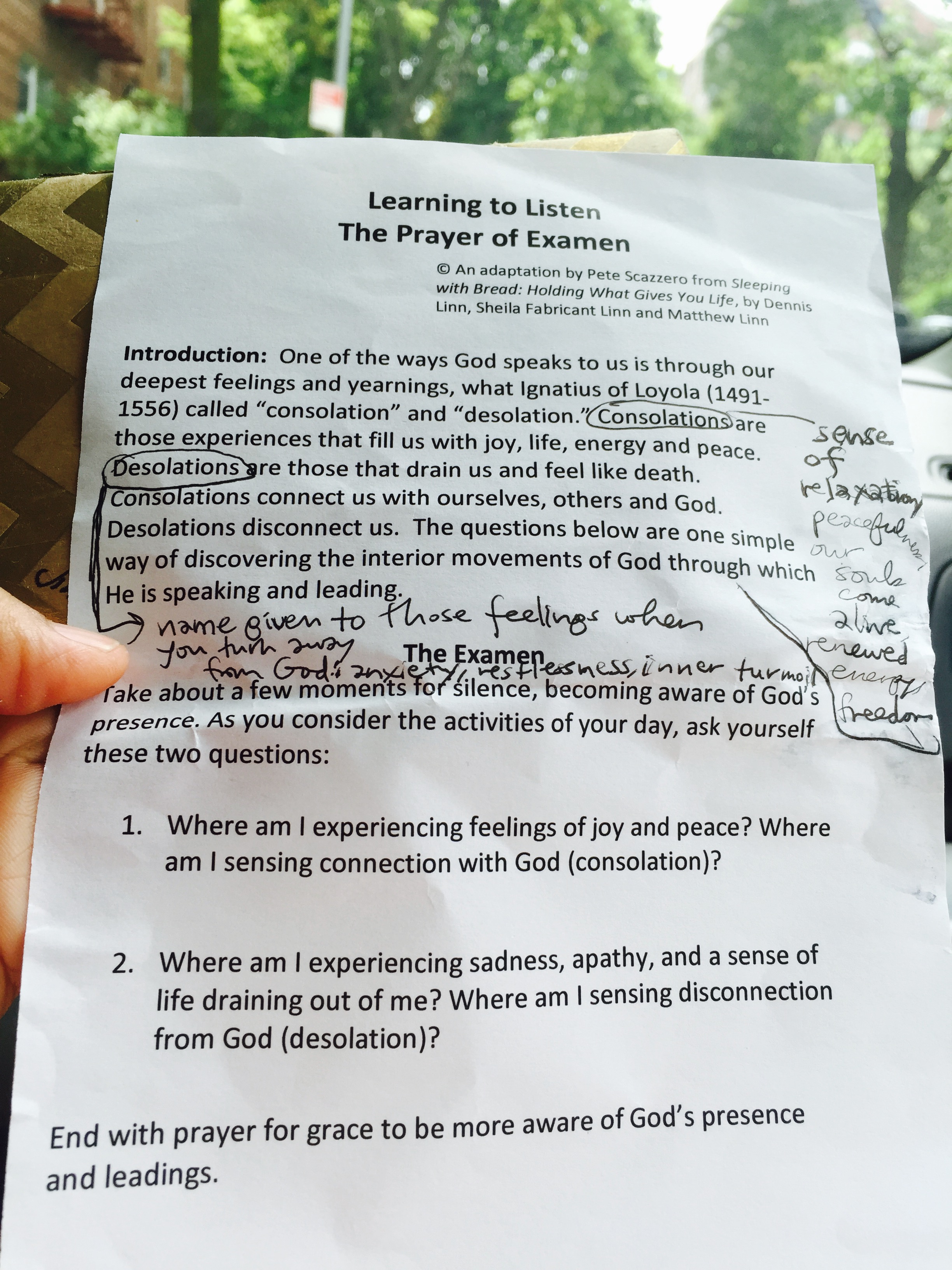 Towards the end of the sermon, Pastor Pete passed out this handout so that we could spend a few moments doing a listening exercise together as a church body, using Consolations and Desolations as a tool: