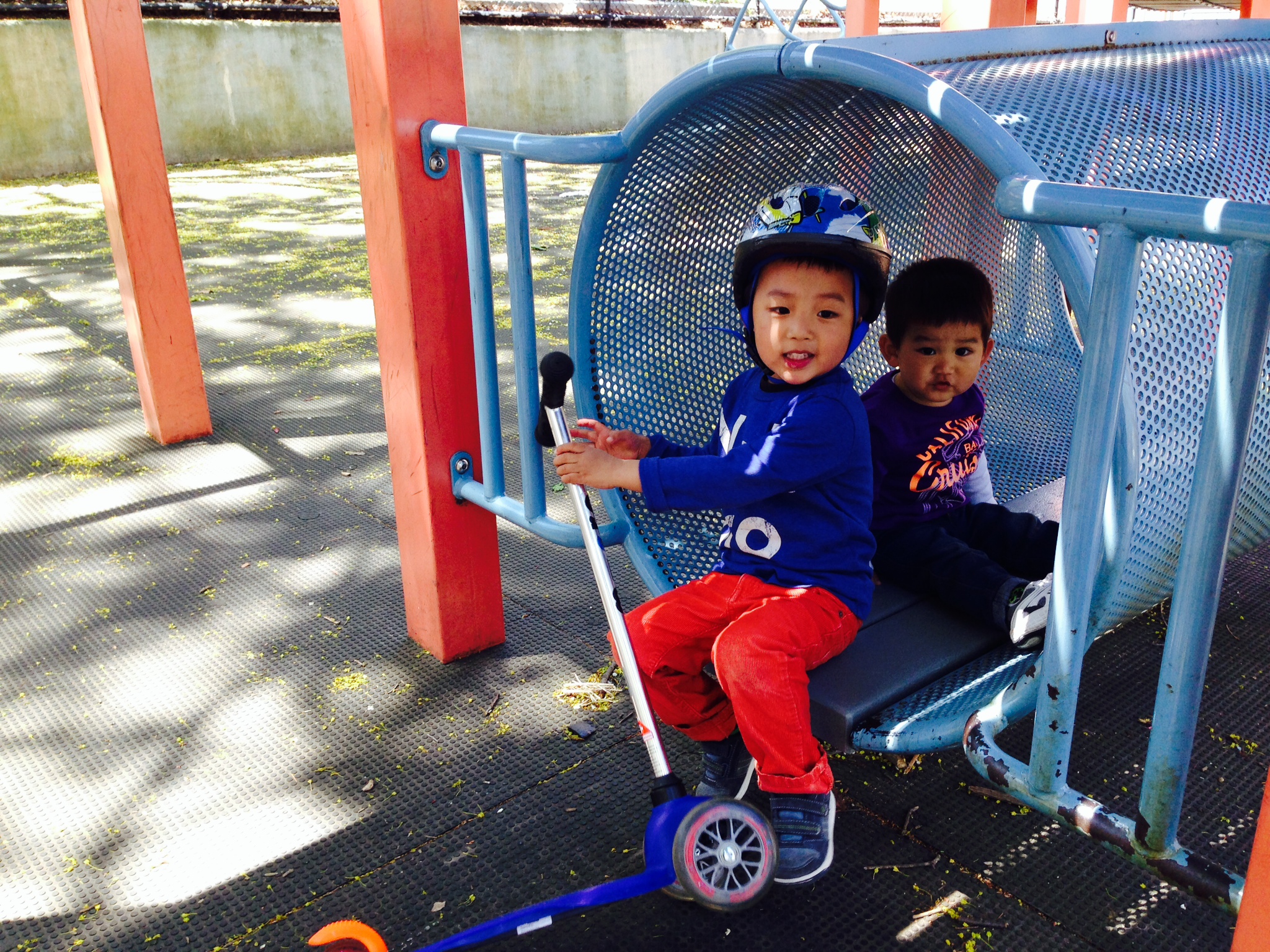 You two imitate each other and yelp whenever you are reunited. Micah likes to do fake falls from his little scooter so Ellis started doing the same. Micah eggs Ellis on to say “Ahpuhdah!” (Korean for “it hurts!”) even though I ask him to at least give him a more positive message to mimic.