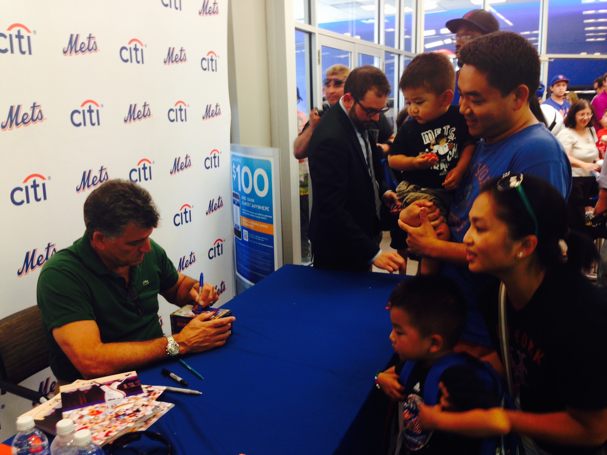In a totally unrelated baseball event, we also made a quick stop to our neighborhood Citibank thanks to a heads up by Uncle Anthony that Kevin’s beloved Keith Hernandez would be signing autographs. Micah spouted off with, “I don’t like him!” when he saw the macrocephalic, dopey Mr. Met coming our way for photo opps, so we became nervous that upon meeting one of Daddy’s idols, Micah would lash out with, “I don’t like you, Mr. Keith Hernandez,” which would have made it Daddy’s turn to blubber.